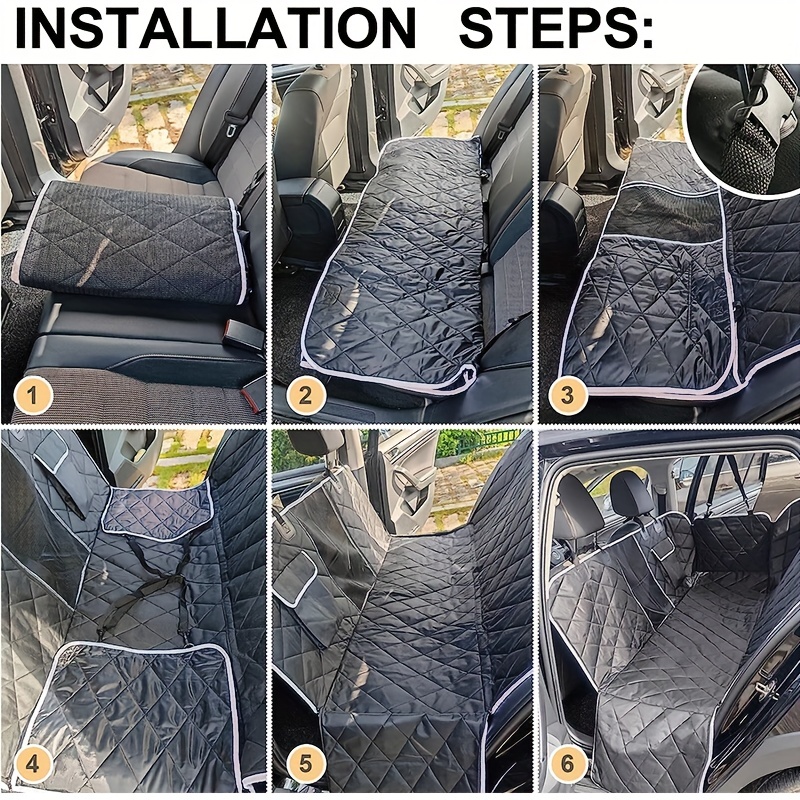 Sbd383b7265f3403d8321e228f19dc083TDetailed measurement diagram for Back Seat Dog Covers showing dimensions of 53.15 inches by 18.9 inches, suitable for Limousines, Family Cars, SUVs, and Trucks.Inside view of a car with a black quilted Back Seat Dog Cover set up in hammock style to prevent pets from falling into the footwell.Detailed view of Back Seat Dog Cover features including the mesh visual window, side zippers, fixing straps, and non-sticky hair fabric.Step-by-step 6-panel instructional guide showing how to install Back Seat Dog Covers using headrest straps and seat anchors.A brown and white dog looking out of a car window with a "Dog Car Seat Cover" text overlay highlighting seat protection and cleanliness.4-panel collage showing a Back Seat Dog Cover hammock mode, water-repellent fabric close-up, dog accessories on the cover, and a dog looking out the window.A medium-sized dog wearing a red bandana standing on a heavy-duty Back Seat Dog Cover installed in the rear of a black SUV, showing side flap protection.Golden Retriever sitting comfortably on a quilted black Back Seat Dog Cover with a mesh window and storage pocket in a car interior.