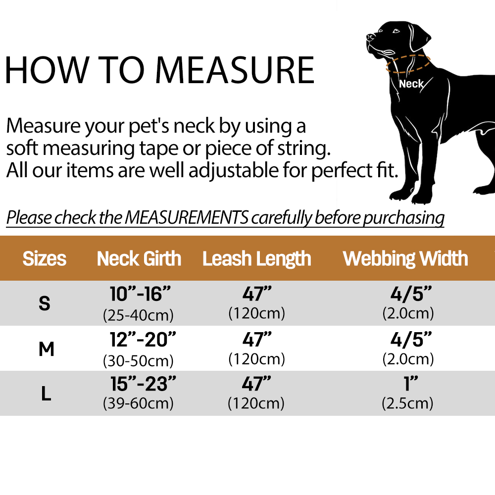 Size Neck Girth Leash Length Webbing Width S 10″ – 16″ (25–40 cm) 47″ (120 cm) 4/5″ (2.0 cm) M 12″ – 20″ (30–50 cm) 47″ (120 cm) 4/5″ (2.0 cm) L 15″ – 23″ (39–60 cm) 47″ (120 cm) 1″ (2.5 cm) 💡 Tip: Measure your dog’s neck using a soft measuring tape or string before ordering to ensure the perfect fit.