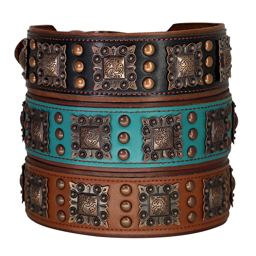 • Intricate Hardware: Each collar features antique-style bronze medallions with swirl engravings, framed by rows of sturdy decorative studs.
