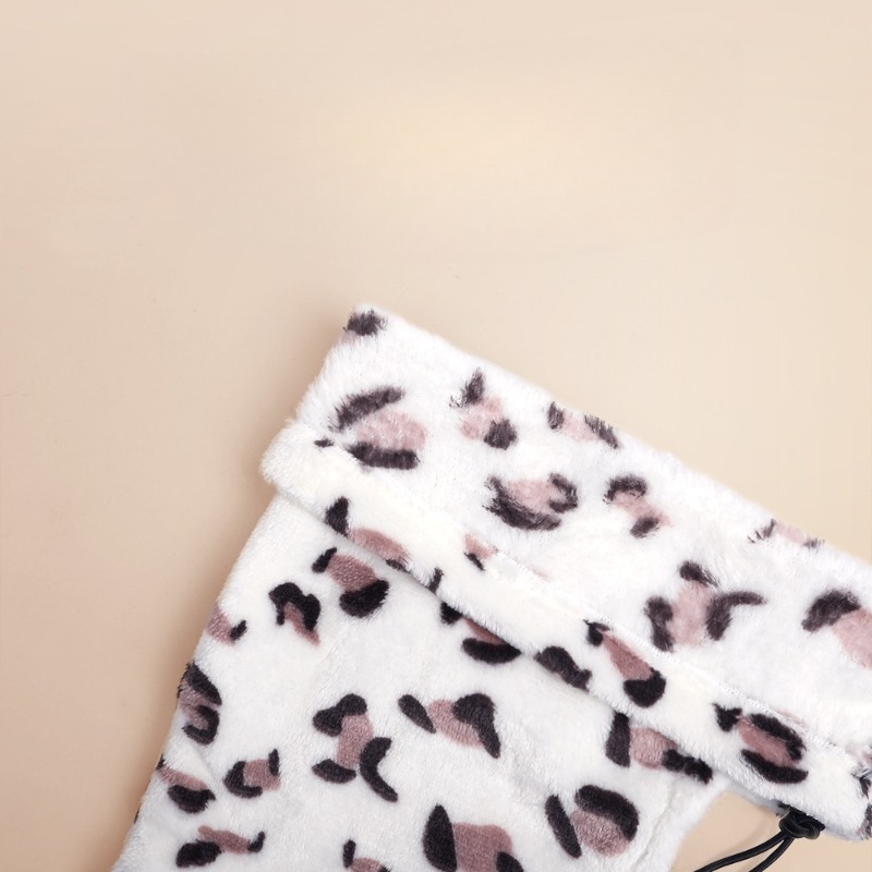 A Golden Retriever wearing a grey fleece hooded snood alongside a display of different color options including red, black, grey, and leopard print. The image demonstrates how the dog earmuffs fit securely over the head and neck to provide warmth and ear protection.Close-up detail of a plush, leopard-print fleece dog accessory. The fabric shows a white base with soft brown and black spots, highlighting the thick, warm material and the elastic drawstring cord at the bottom.A vibrant red fleece dog snood and neck warmer lying flat on a textured surface. The product features a black adjustable drawstring toggle for a custom fit and a small decorative pom-pom on the top corner.