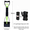 A lifestyle collage showing a woman walking her dog. Two black-and-white sub-images with "X" marks show the discomfort of bending over or dealing with odors, contrasted with the main color image of the woman standing upright and easily carrying the scooper.A side-by-side comparison featuring a happy Golden Retriever sitting on the left and the lime green pooper scooper on the right, indicating that the toolA product display showing three color variations of the pooper scooper: solid black, black with lime green accents, and black with royal blue accents. Text above lists the material as "ABS material" and notes it is applicable for all kinds of dogs.A lime green and black pooper scooper leaning against a teal wall. The long handle is fully extended, showing the contrast between the black shaft and the bright green inner trigger and scoop connectors.A four-step photographic guide showing how to assemble the foldable scooper. Steps include receiving the goods, locating the slot, straightening the handle, and locking the sliding card slot into place for use.An instructional graphic showing two methods for sanitary waste removal. Method 1 shows placing a plastic bag over the scooper jaws. Method 2 shows placing toilet paper over the waste before scooping. Both methods demonstrate a hands-free cleaning process.Close-up of the lime green plastic jaw of the scooper featuring two thick metal tension springs. Text overlay reads "04 Excellent Material," highlighting the durable ABS plastic and strong bite force for secure waste pickup.Two pooper scoopers, one blue and one black, leaning against a modern wooden cabinet in a minimalist living room. The image illustrates how the slim design allows the tool to blend into home decor without taking up much space.A person holding a long-handled black and blue pooper scooper by its ergonomic handle. The tool stands vertically against the personA foldable black and lime green pet pooper scooper shown in a partially folded V-shape. Two inset images demonstrate the heavy-duty plastic hinge mechanism in close-up detail, highlighting the "Easy to fold and easy to store" feature.