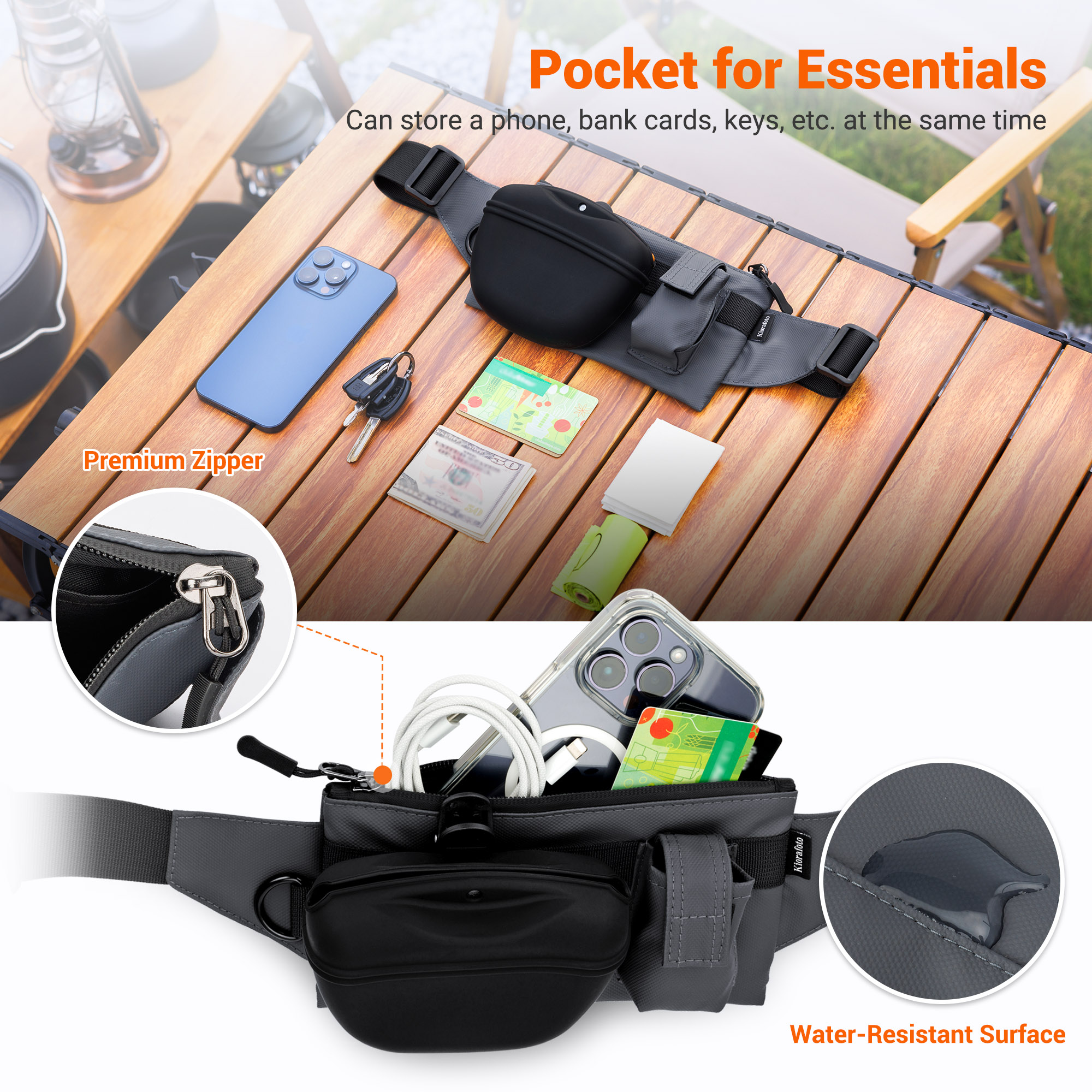 A Place for Everything: * The Tech Zone: A water-resistant zipper pocket keeps your smartphone and bank cards bone-dry.